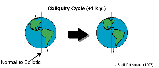 Obliquity. Not only does the earth’s elliptical orbital shape vary, but so does its axial tilt. You’re all aware, I’m sure, that the earth’s axis of rotation is tilted about 23½ degrees from the perpendicular, with respect to the ecliptic (plane of orbit). This is what gives the northern and southern hemispheres opposite seasons; why, in other words, I’m freezing my arse off as I sit here in Tasmania typing this, while most of you are luxuriating in a supposed barbecue summer. Why hasn’t anyone told people on the Californian coast?