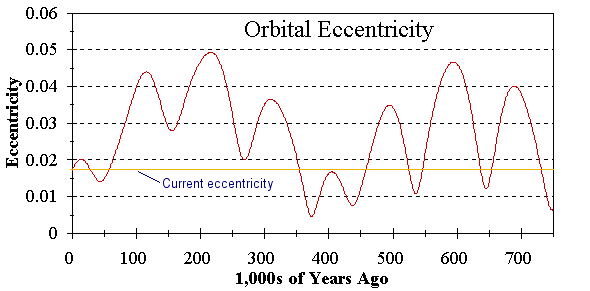 Eccentricity. This is a measure of how flattened an ellipse is. An ellipse with an eccentricity of zero is actually a circle. The earth’s orbital eccentricity varies between about 0.005 and 0.05, predominantly in two superimposed oscillations of 100,000 and 400,000 years. The 100,000 year one is the most important Milankovitch cycle, as we’ll get to later.
